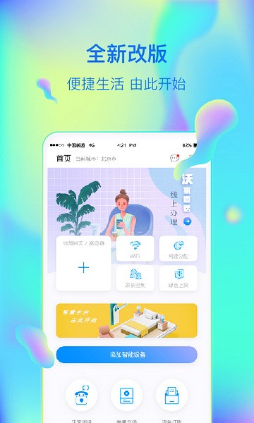 智慧沃家(现已改名联通智家),居家外出都能通过手机掌控全屋网络与智能设备,宽带、路由、机顶盒等设施可远程调控,上网时段与网速都能灵活设置。影音娱乐、业务办理等服务集中接入同一端口,简化家庭数字生活操作,用一站式管理提升居住便捷度与安全性。
