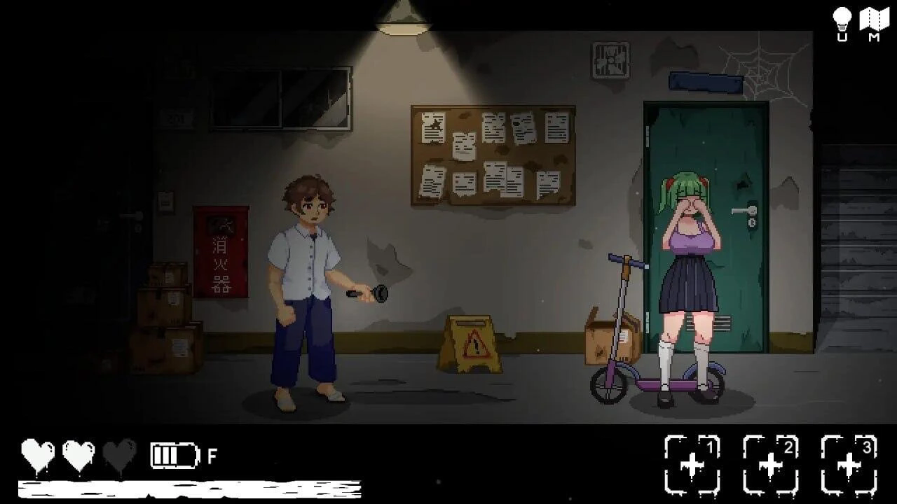 像素世界漫游:通过键盘方向键(↑↓←→)或移动摇杆(触屏操作)控制角色在公寓各楼层、房间间移动。像素化的场景细节丰富,如斑驳的墙壁、老旧的家具、闪烁的灯光等,需仔细观察每个角落寻找可互动元素。