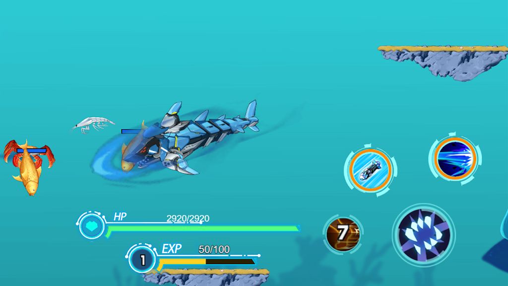 2、收集宝藏和道具,提升机械鲨鱼等级和能力;